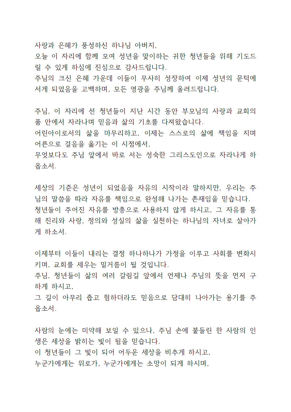 이번에 성년이 되는 청년들을 축하하기 위한 성년 축하 기도문입니다.