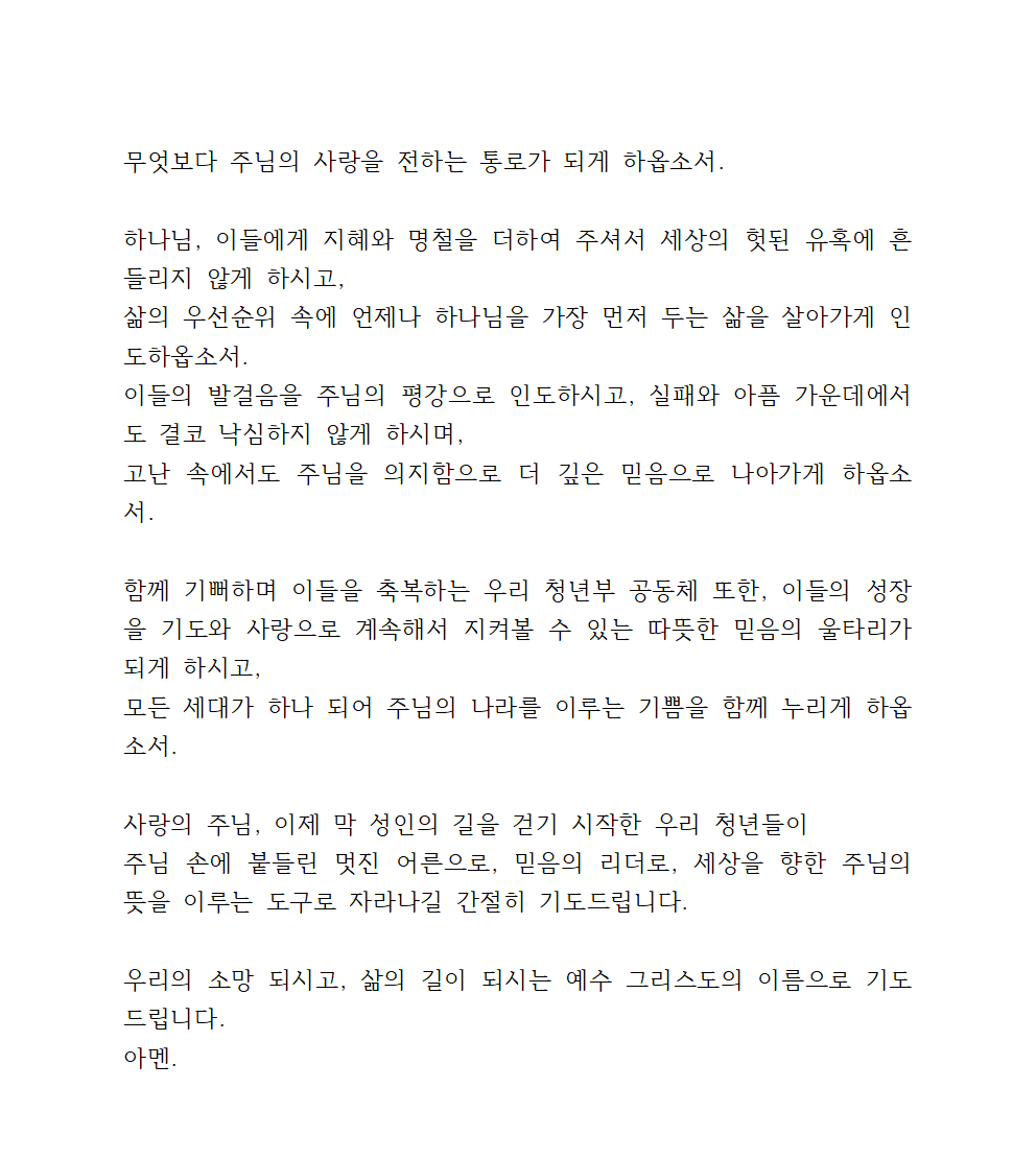 주님, 이 자리에 선 청년들이 지난 시간 동안 부모님의 사랑과 교회의 품 안에서 자라나며 믿음과 삶의 기초를 다져왔습니다.