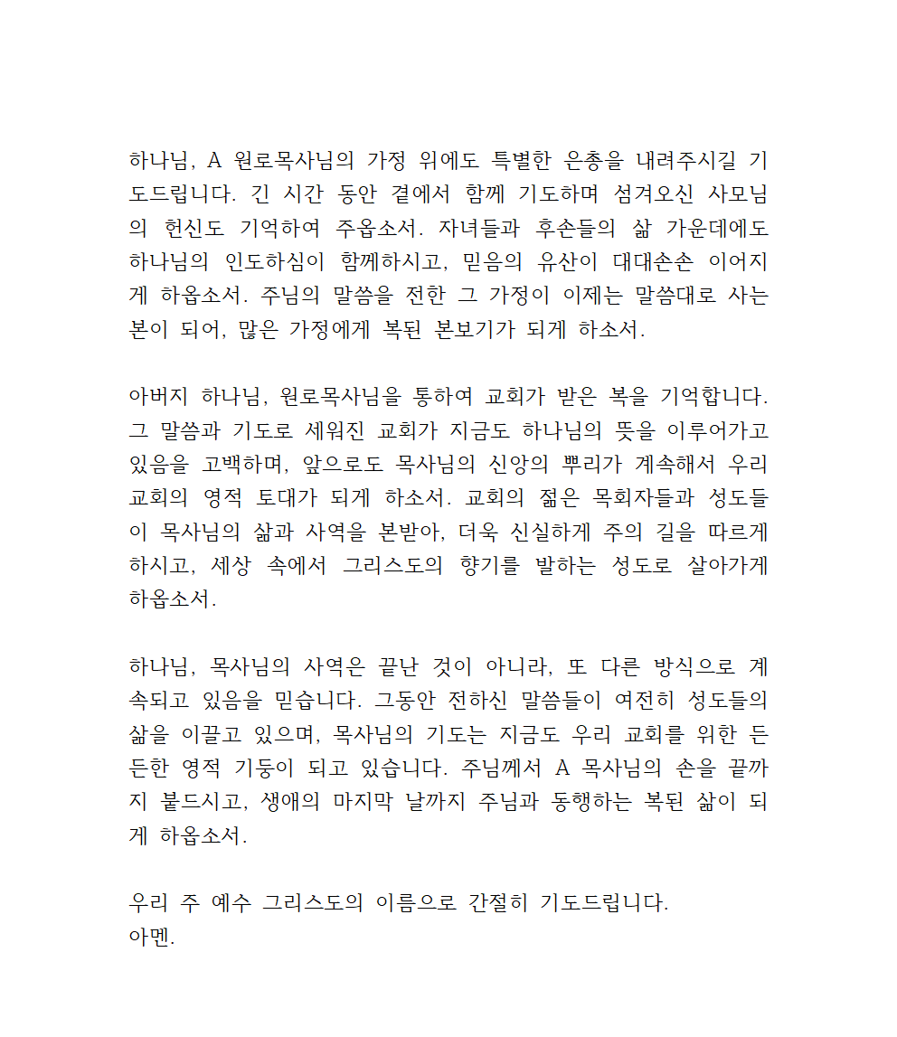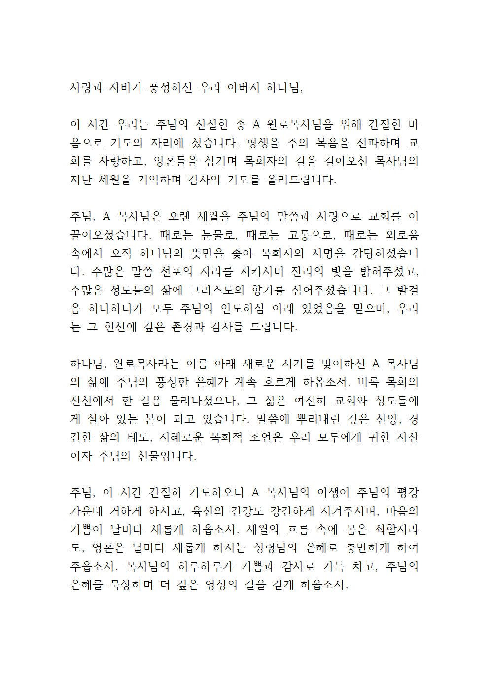 이 시간 우리는 주님의 신실한 종 A 원로목사님을 위해 간절한 마음으로 기도의 자리에 섰습니다. 평생을 주의 복음을 전파하며 교회를 사랑하고, 영혼들을 섬기며 목회자의 길을 걸어오신 목사님의 지난 세월을 기억하며 감사의 기도를 올려드립니다.