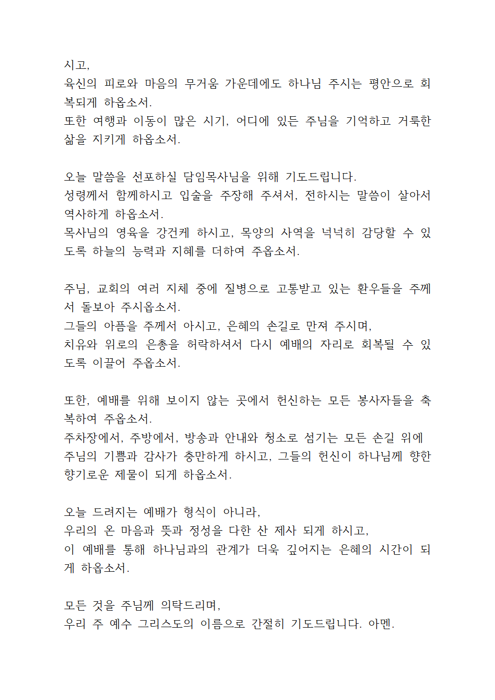 봉사의 자리를 묵묵히 지키는 손길들을 축복하여 주시고, 안내, 주방, 차량, 방송, 미화, 교사, 찬양으로 섬기는 모든 이들의 수고를 주님께서 기쁘게 받으시며, 그들의 가정에도 하늘의 평강과 형통함을 부어 주시옵소서.