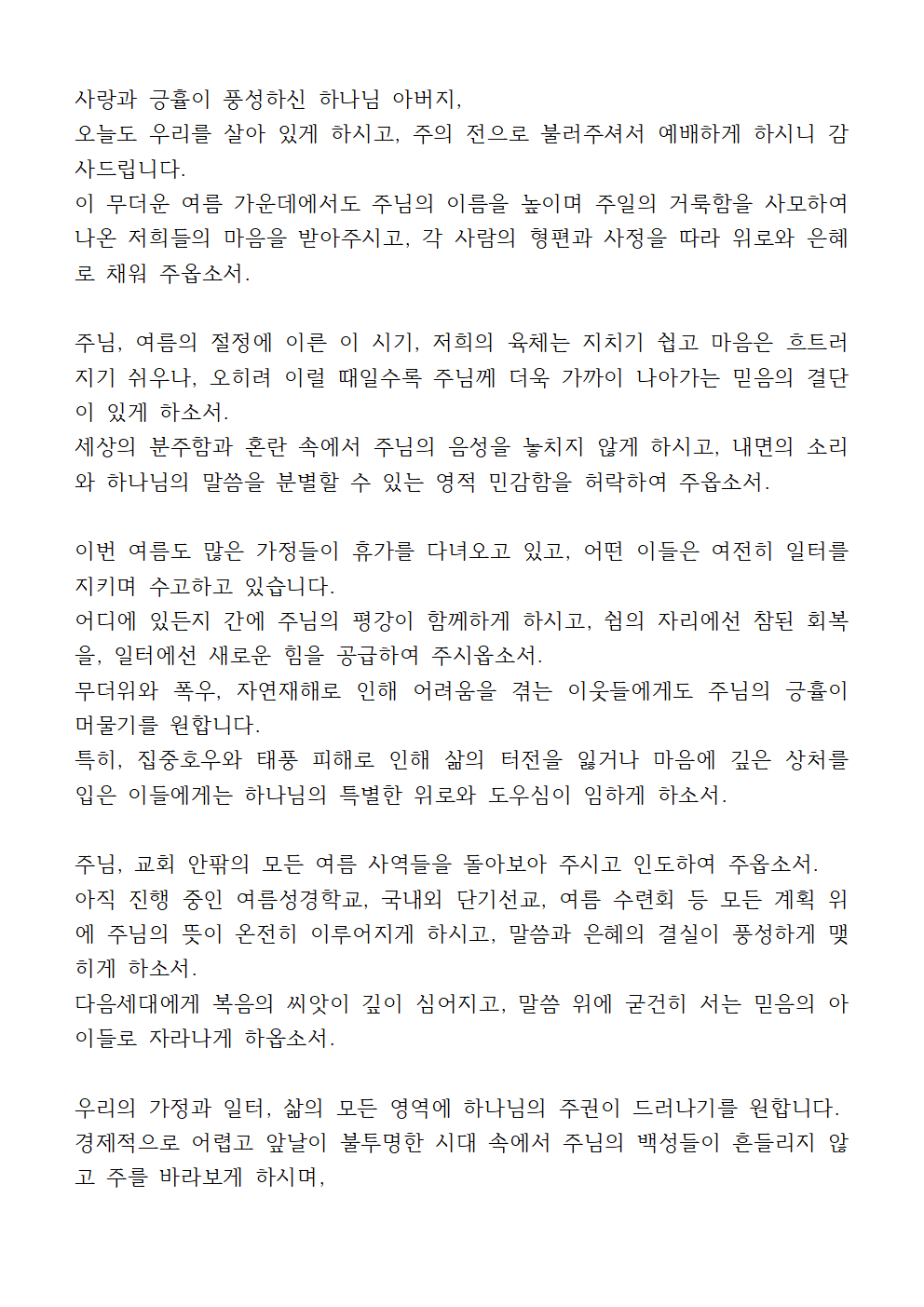 8월 수요예배 대표기도문 (셋째 주)