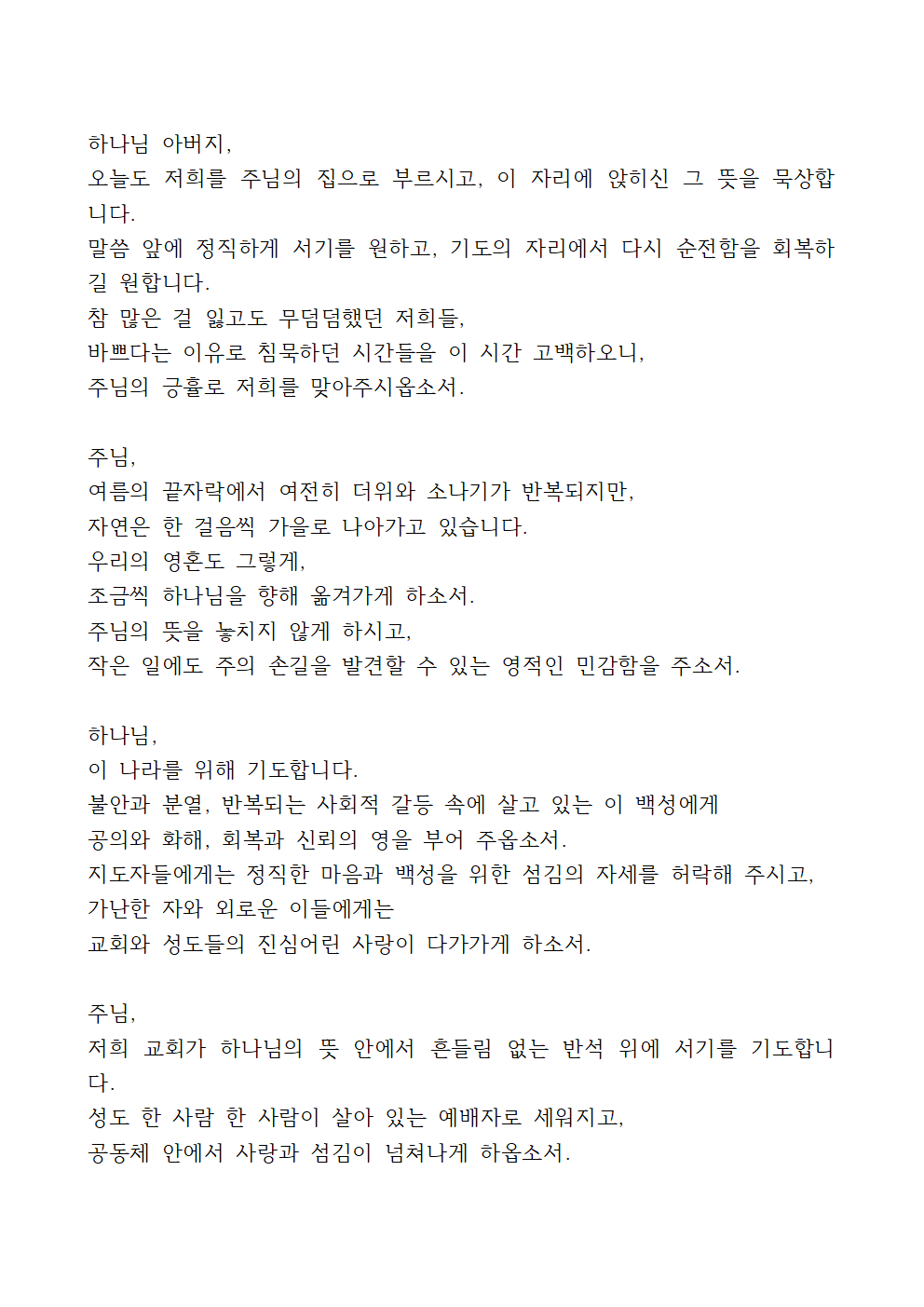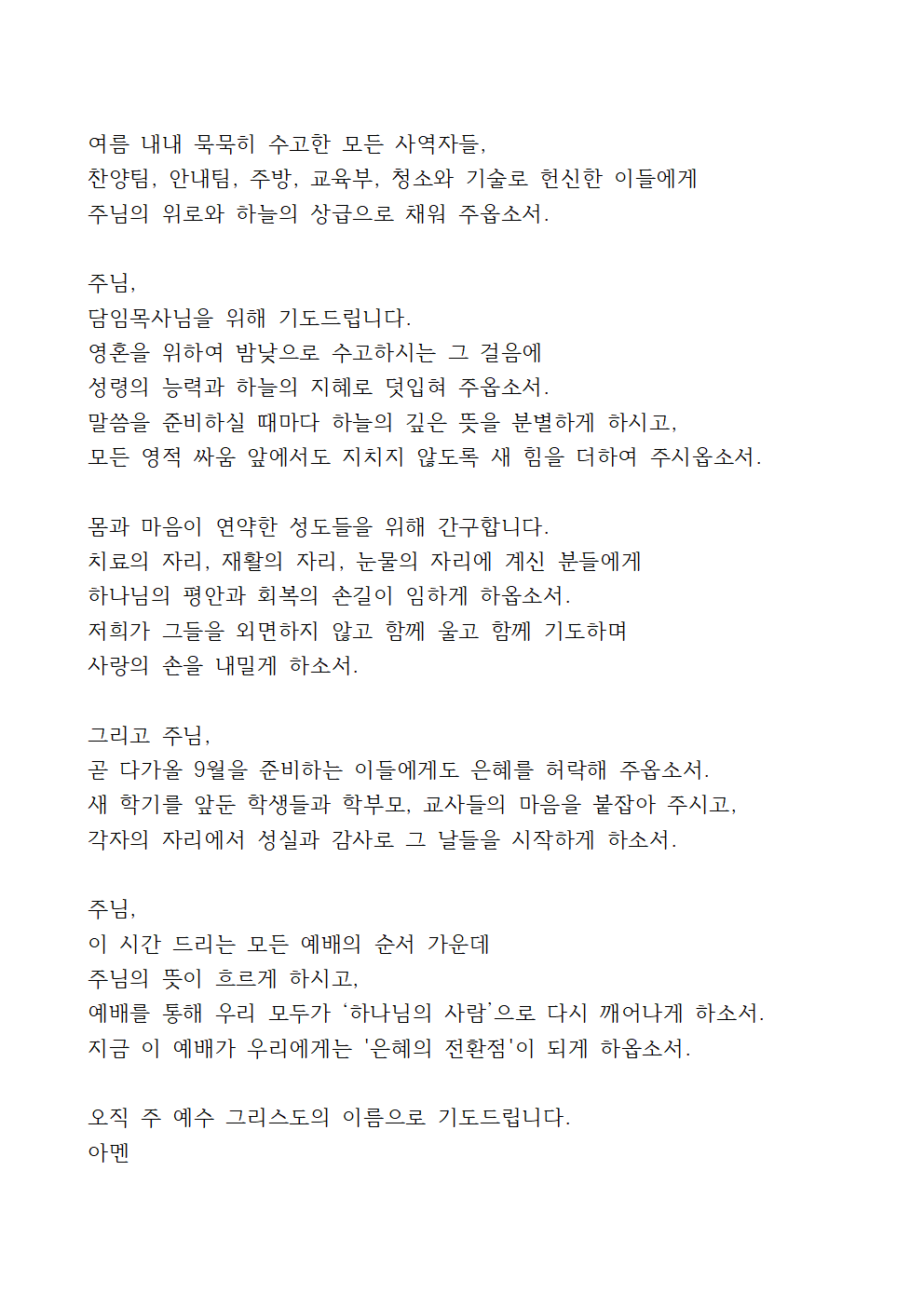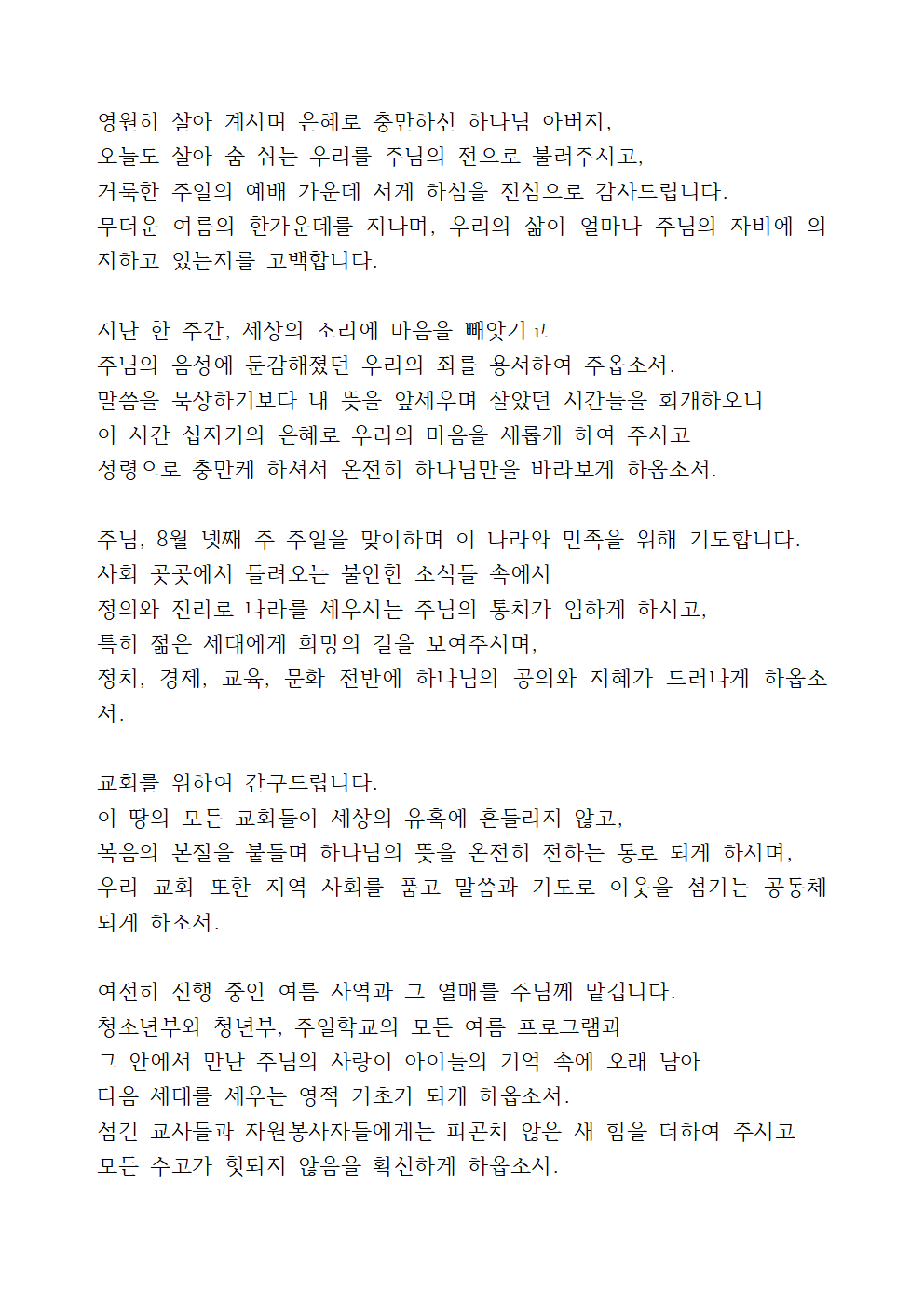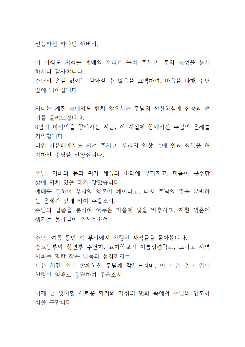 8월 4주 대표기도문 예시문
