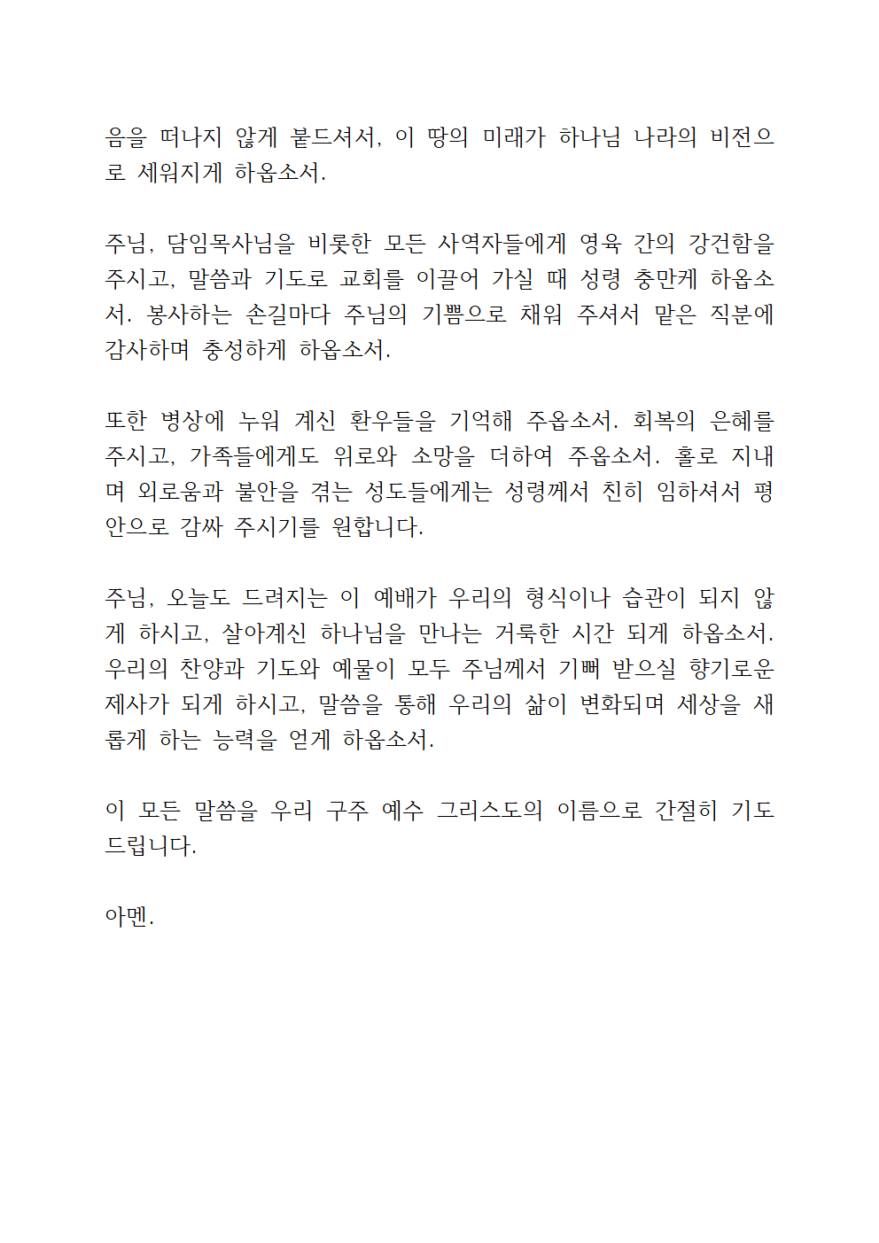 또한 병상에 있는 환우들을 주님께 의탁합니다. 치료의 손길로 함께하셔서 육신의 회복뿐만 아니라 영혼의 평안도 누리게 하옵소서. 외로운 노년을 보내는 어르신들과 시험으로 지친 청년들에게도 위로와 소망을 허락하여 주옵소서.