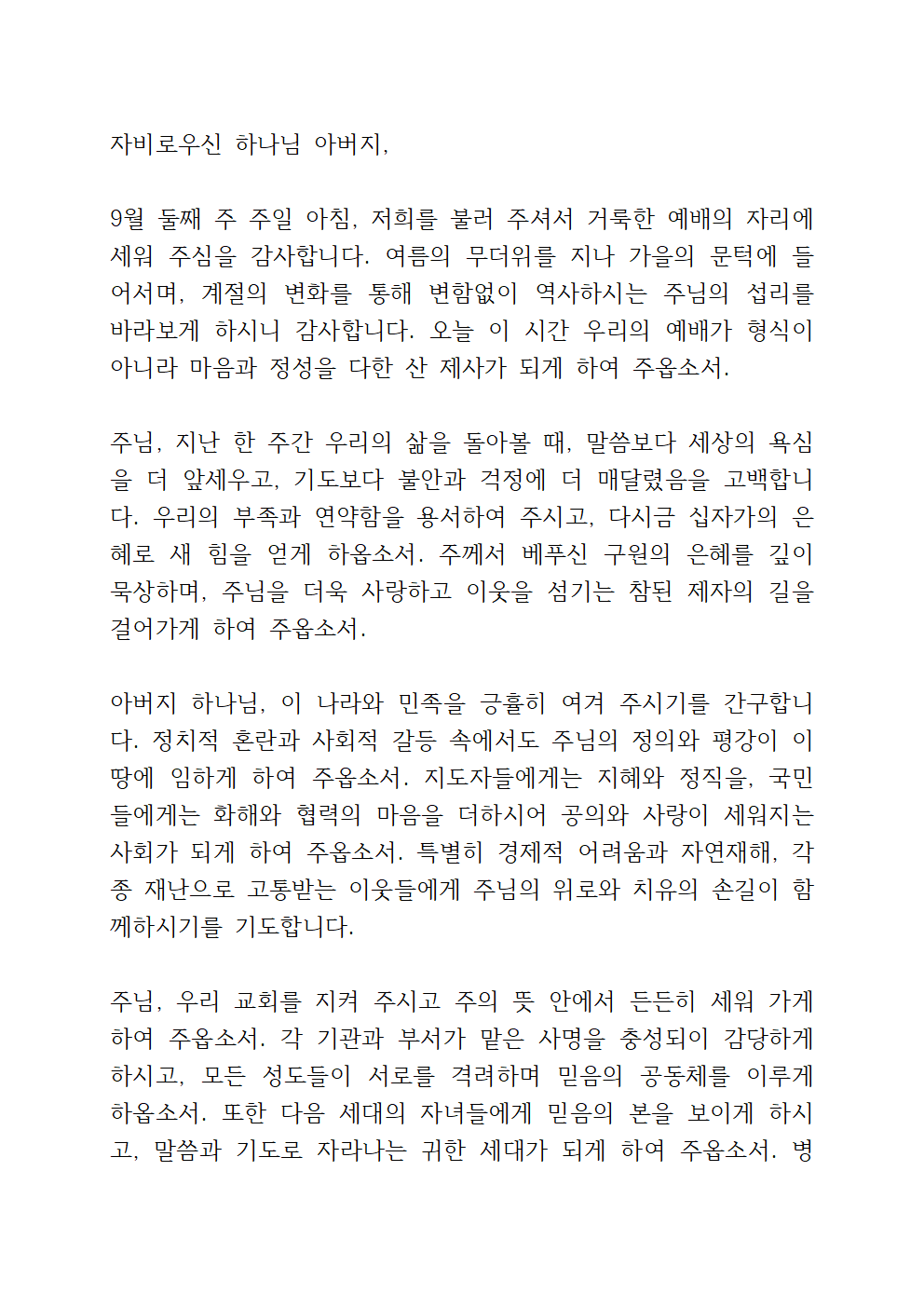 9월 2주 대표기도문을 준비하실 때 아래의 기도문들을 참고해 보세요~!!