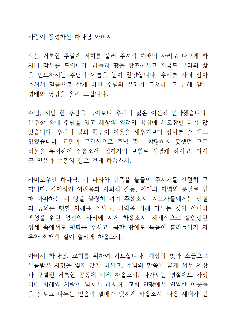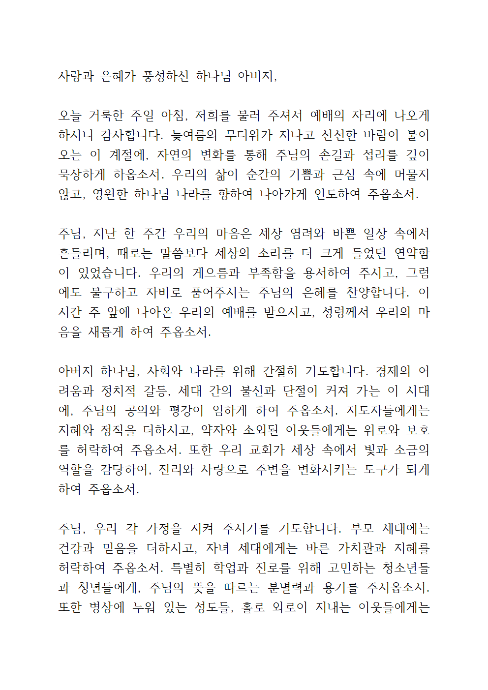자비로우신 주님, 이 땅을 위해 기도합니다. 정치와 사회가 혼란 가운데 있을지라도 하나님의 공의와 정의가 드러나게 하시고, 분열과 갈등 대신 화해와 협력이 이루어지게 하여 주옵소서. 경제적 어려움으로 고통받는 이웃들이 많습니다. 실업으로 힘든 자들에게는 일자리를, 생계에 어려움이 있는 가정에는 도움의 손길을 열어 주옵소서. 기후 변화와 자연재해로 신음하는 지구를 긍휼히 여기사, 창조세계를 맡은 청지기답게 책임 있게 살아가게 하옵소서.